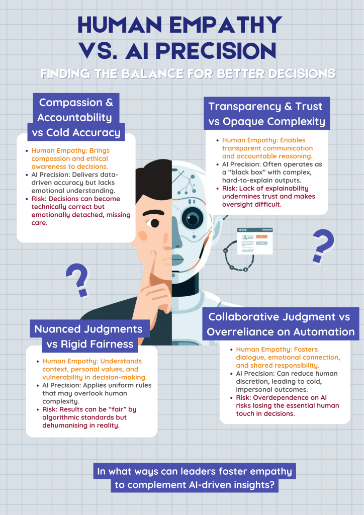 Furthermore, empathy and emotional intelligence acts as a counterbalance to the risks of dehumanisation in highly automated environments. Decisions made solely through algorithms may prioritise efficiency, accuracy, or cost-effectiveness, but they cannot account for the psychological, emotional, and ethical dimensions of human life. For example, an AI system may recommend layoffs based on performance metrics, but leaders with high EQ can navigate the process in a way that communicates respect, provides support, and mitigates the psychological toll on employees. It encourages leaders to ask questions that data alone cannot answer: How will this decision affect trust, morale, and social cohesion? Could the choice unintentionally reinforce biases or inequalities?