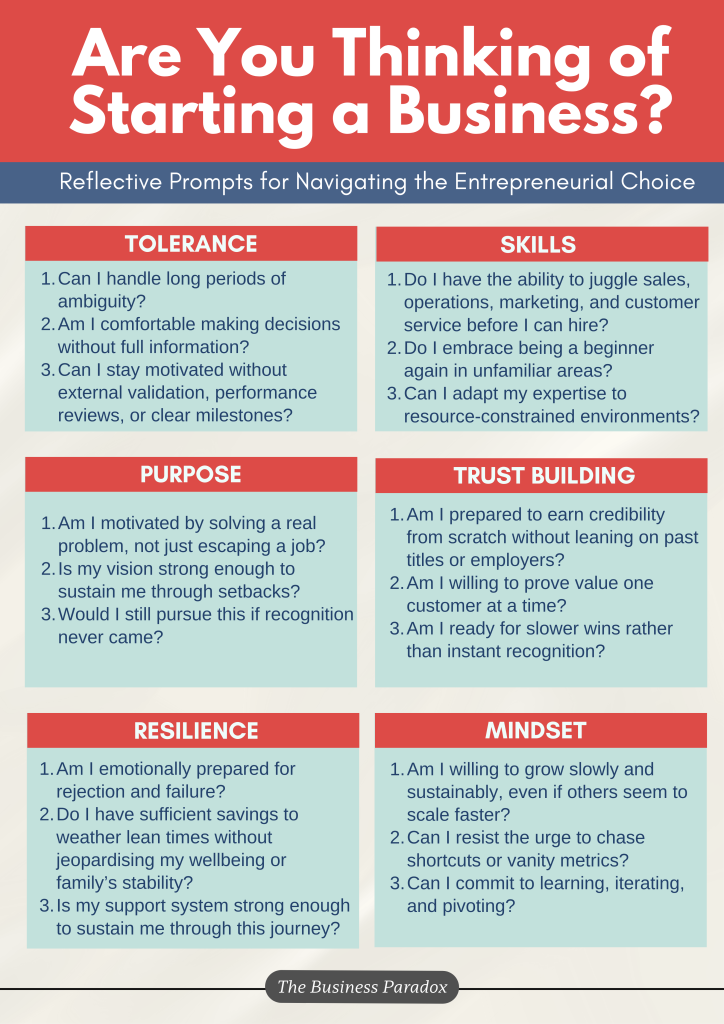 For many mid-career professionals, the lure of entrepreneurship intensifies at the exact moment corporate life begins to feel constrained. This happens when growth plateaus, politics overshadow purpose, or the work no longer aligns with personal values. Career choices at mid‑life should not be rooted in dissatisfaction, but in the pursuit of purpose. It calls for a clear assessment of your resilience, strategic thinking, risk appetite, and long-term vision.