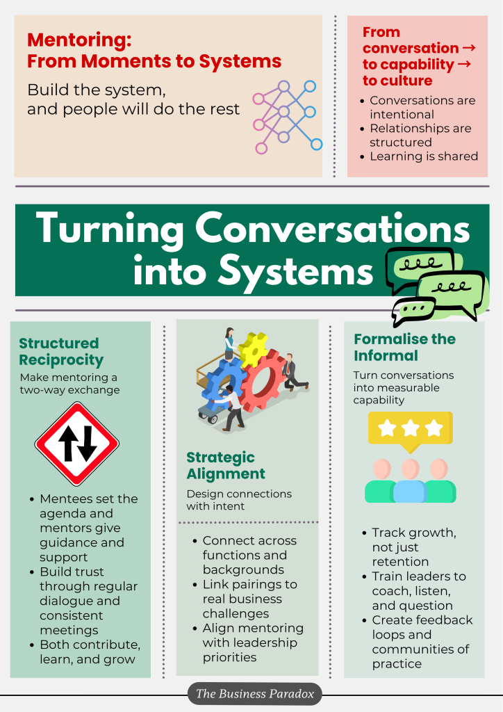 When done well, mentoring evolves from occasional conversations into a learning system that keeps the organisation inclusive and innovative. It shapes how people lead and how teams connect. Ultimately, leaders do not rise because they have all the answers. They rise because they build systems that help them listen, learn, and adapt, over and over again.