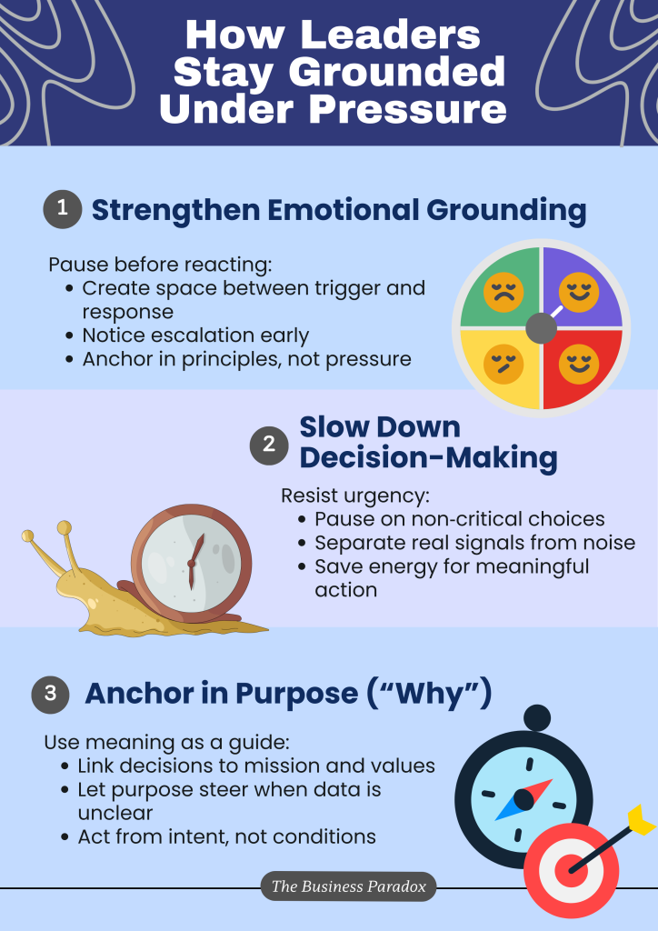 Staying steady in a permacrisis is about shaping how pressure moves through the organisation. The most important mechanism here is emotional contagion: teams absorb the emotional state of their leader. Emotional grounding allows leaders to notice pressure before it escalates into visible reactivity. Slowing down interrupts the instinct to confuse urgency with action, creating space for clearer judgment. Anchoring in purpose ensures that decisions remain coherent even when information is incomplete or constantly shifting.
