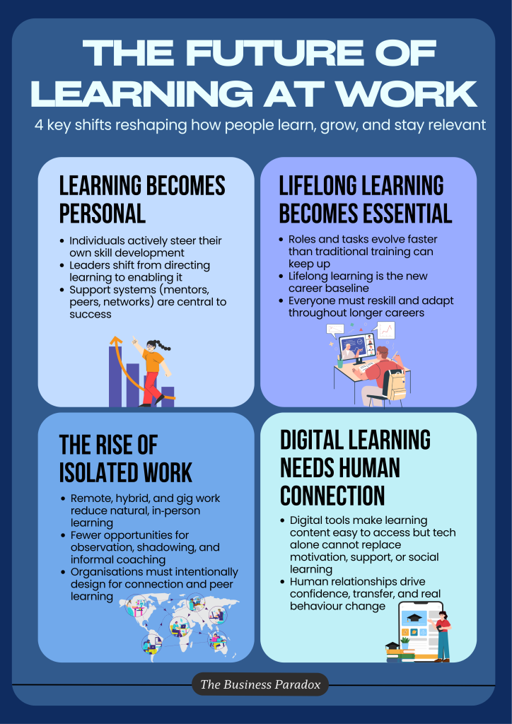 The rules of workplace learning are being rewritten by profound changes in how work is organised, experienced, and sustained. For many workers, this translates into a future where continuous, lifelong learning is essential to remain employable. At the same time, learning is shifting away from organisation-centric models designed to serve company needs, toward more person-centred approaches that recognise individuals must increasingly navigate their own development across roles and life stages.