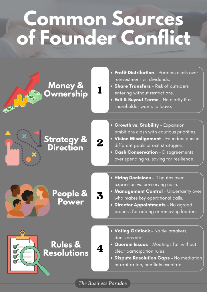 Founder conflicts often happen when businesses start without clear rules. Initially, partners rely on goodwill and friendship, believing that trust will carry them through. Business formalities demand structure and accountability, yet personal relationships can clash with these obligations.